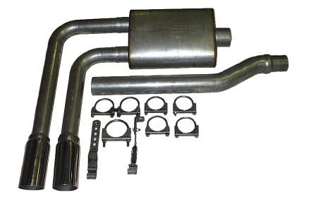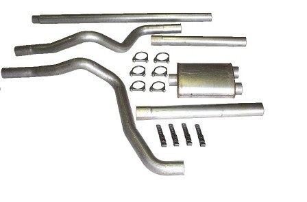 Dual rear design with an exit near stock location and 2-1/4″ mandrel bent aluminized dual tail pipes. Includes a (HVS) double-wrapped heavy-duty welded performance muffler. All kits are cat-back kits, most convert to single 3″ exhaust after the converter into the muffler. All necessary pipes, hangers, clamps, muffler, hardware, 2 stainless steel angle cut tips, and instructions included. Pipes clear standard spare tires and trailer hitches. These systems are quieter than our other dual systems and 3″ single systems.
