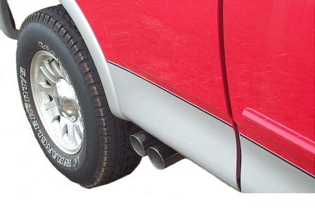 Split rear design with 2-1/4″ mandrel bent aluminized dual tail pipes. Includes either a standard turbo muffler, or a (HVS) double-wrapped heavy-duty welded performance muffler, or our HPM welded performance turbo muffler as a special order. All kits are cat-back kits, most convert to single 3″ exhaust after the converter into the muffler. All necessary pipes, hangers, clamps, muffler, hardware, and instructions included. Pipes clear standard spare tires and trailer hitches.