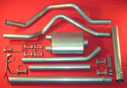 note:  for factory dual exhaust equipped vehicles, kit starts at the 2-bolt flange at the inlet of the muffler, and reuses the factory exhaust tips/connection.