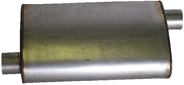 Double-wrapped welded aluminized mufflers with two baffles and one center v-baffle (most configurations). The double-wrapped shell helps to give a quieter sound than single-wrapped performance mufflers. Mufflers are not reversible, body sizes are 5-1/2″ x 11″ oval, or 4″ x 9″ oval. The 5-1/2″ x 11″ oval mufflers are shaped like our HPM turbo mufflers on the outside, but should be used when you are looking for a slight increase in noise and a higher exhaust flow. This muffler has a much lower level of resonance and drone in the cab when compared to other straight through performance mufflers. It is loud upon accelleration, but quiet at speed. This is due to the double-wrapped shell, which is virtually non-existent on performance mufflers from our competition.